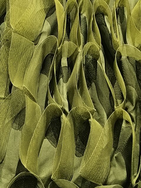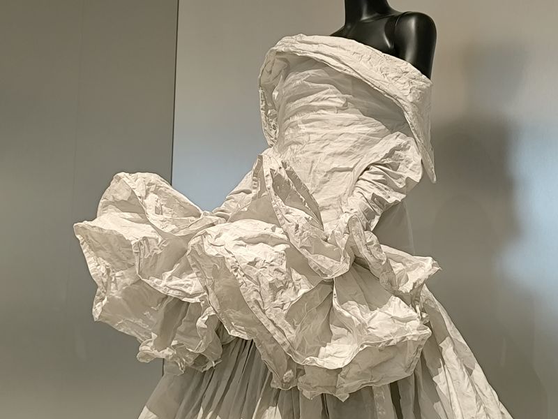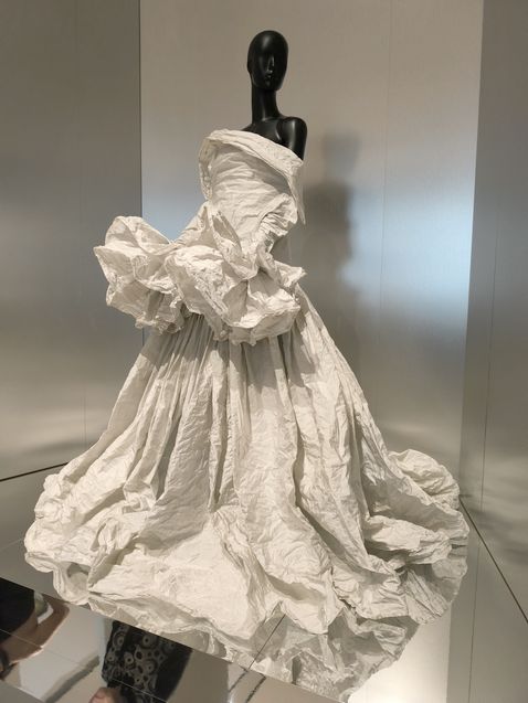 Ce tissu froissé évoque les plis & drapés d’une sculpture. Cette robe est impressionnante à regarder !