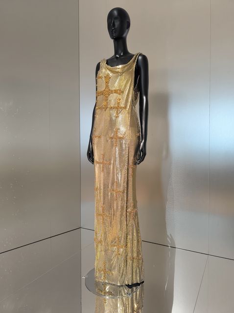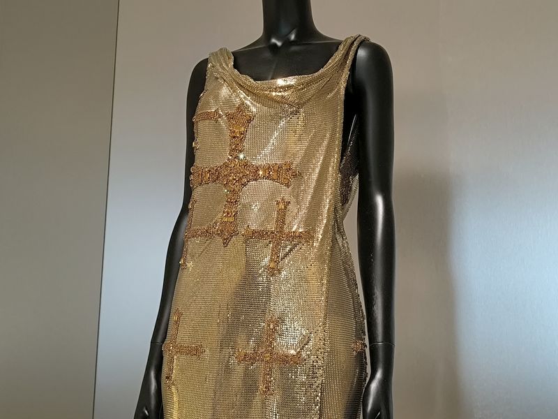 Robe longue en mesh de métal brodée de croix grecques en cristaux Swarovski.