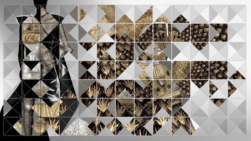 Le motif géométrique répété fait référence aux pavements de marbre ou de faïences emblématiques des sols des palais de la Renaissance.