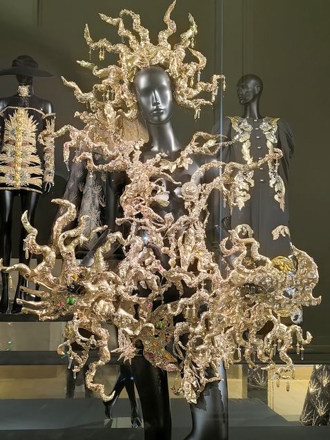 Robe, structure métallique recouverte d’ornements en relief de cuir moulé à la main, décorés de feuilles d’or et rebrodés de cabochons, strass et bijoux vintage. Cette robe, je l’avais déjà vue lors de la fabuleuse exposition consacrée à Schiaparelli fin 2022. J’en parle dans cet article.