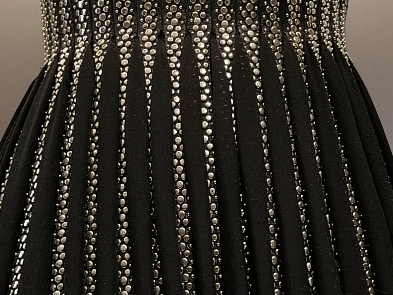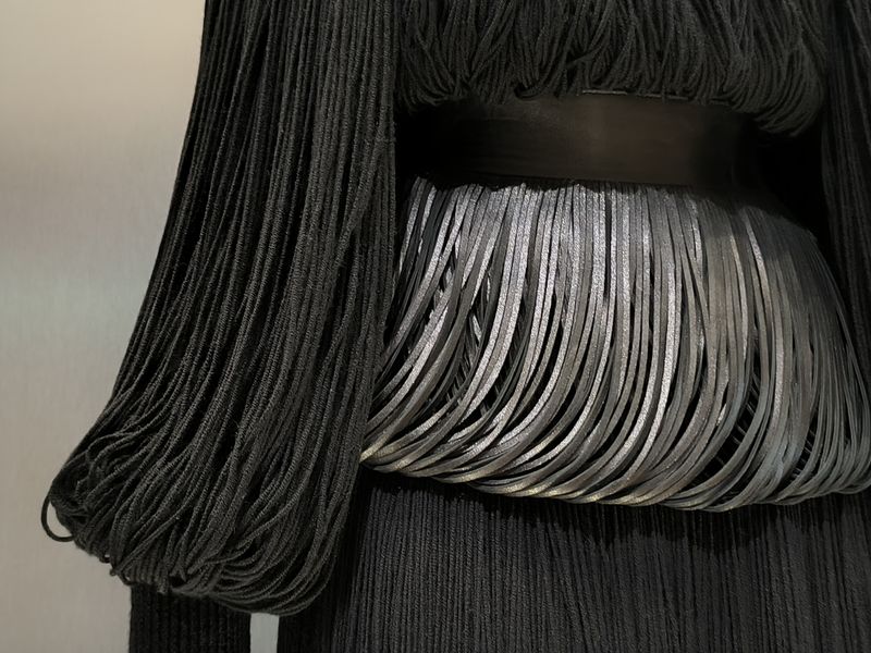 Robe, cuir d’agneau plongé noir, orné de clous en métal, franges au dos de la même matière, plissée en bas par godets de mousseline de soie noire.