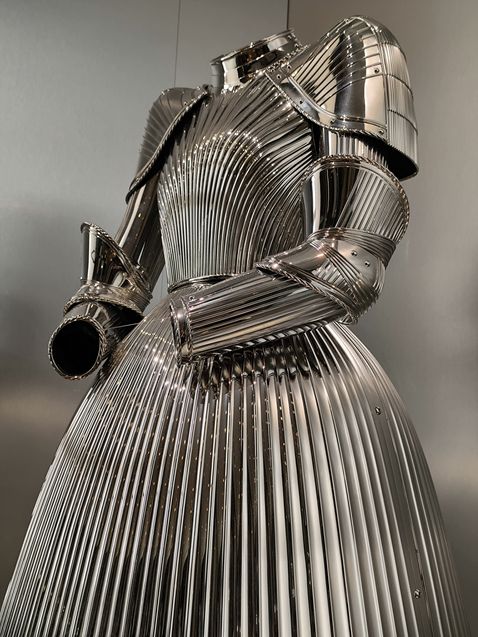 Robe armure, résine Galvanisée. Cette robe, inspirée des armures anciennes, est beaucoup plus légère que les armures en acier car celle-ci est en résine et possède à l’intérieur un tissu floqué noir qui permet au mannequin de porter cette tenue sans se blesser…