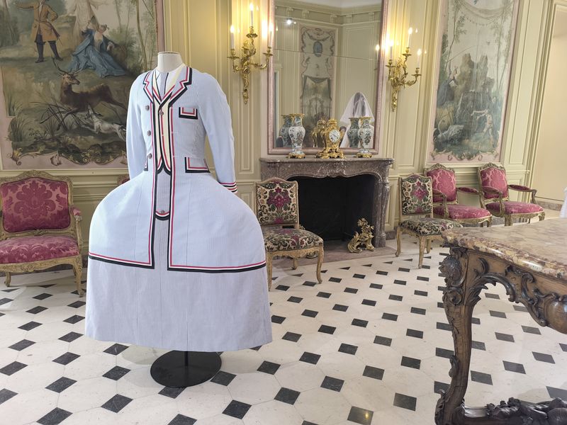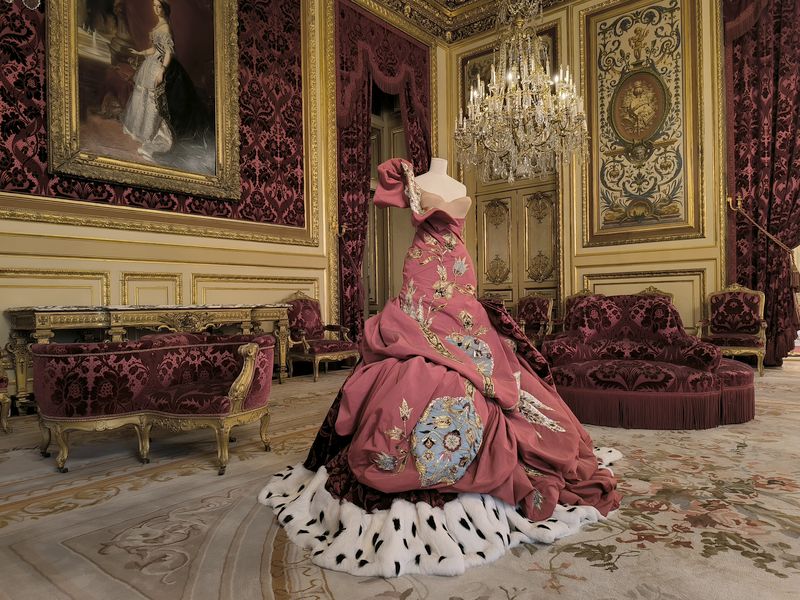 Manteau en satin cuir de soie brodé. John Galliano s’inspire ici de Marie-Antoinette. Cette robe s’accorde parfaitement avec les meubles de cette pièce.