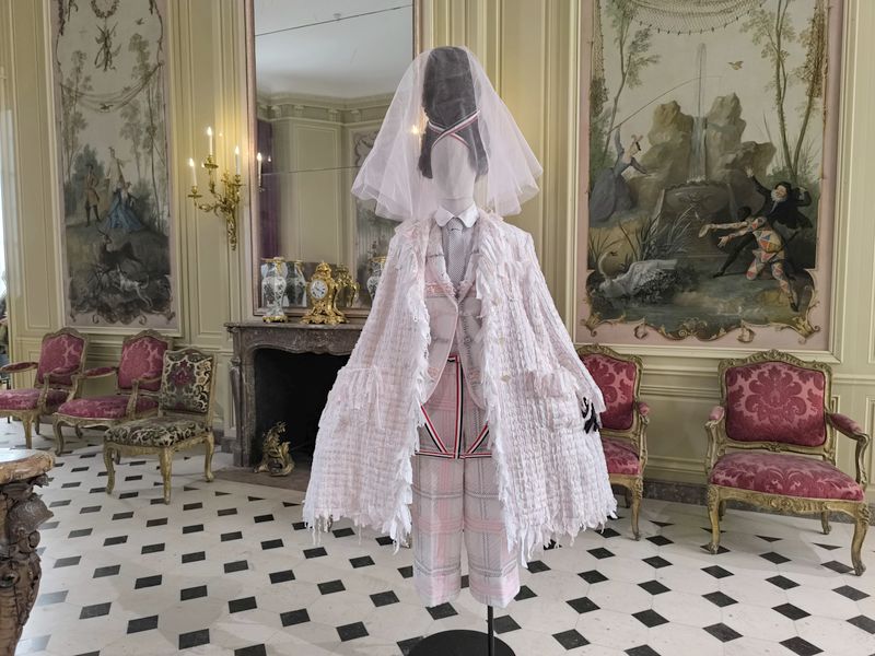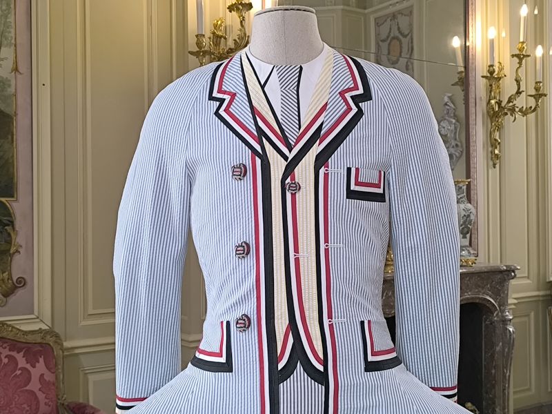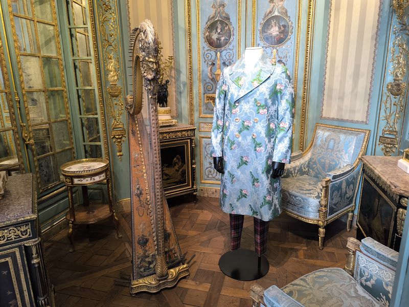 Manteau croisé en jacquard floral, pantalon de jogging à carreaux. Le tissu de ce manteau fait référence aux tissus d’ameublement et au vocabulaire décoratif du 18e siècle. On remarquera au passage la harpe datée de 1787 qui est absolument superbe !