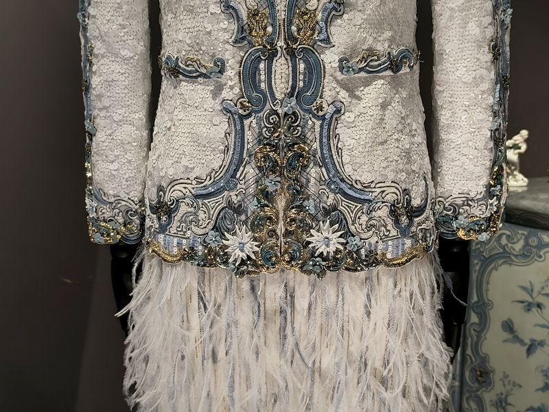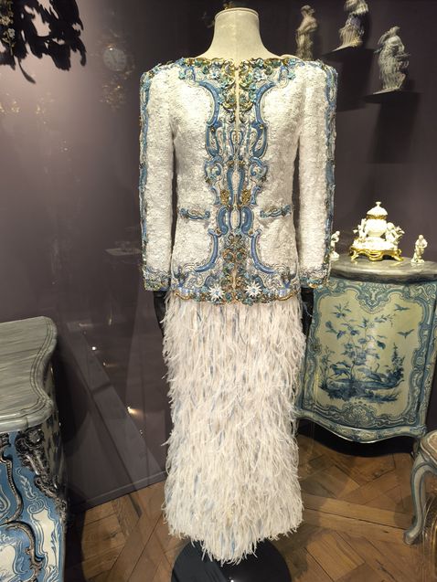 Ensemble, veste brodée par Lesage d’un motif décoratif inspiré d’une commode du 18e siècle conservée au Musée du Louvre. Jupe brodée de plumes d’autruche par Lemarié.