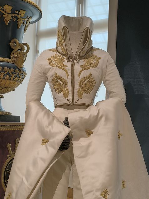 Ce modèle offre une vision très impériale avec ces broderies et ce grand col digne des uniformes de Napoléon 1er. Les manchons disproportionnés donnent l’impression d’une cape ou d’une traîne.