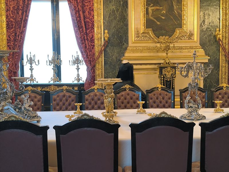 Dans les photos suivantes, nous entrons dans les somptueux appartements de Napoléon III (décor style Louis XIV). Ces pièces, à l’opulent décor, étaient aménagées pour abriter le ministère d’Etat sous le Second Empire (1852-1870). On y voit notamment une salle de réception et une salle à manger toujours pourvus de leur mobilier d’origine : omniprésence de l’or, lustres imposants, riche décor sculpté au niveau des plafonds et des peintures décoratives. Ces appartements constituent un exemple unique de décor de cette époque dans Paris.