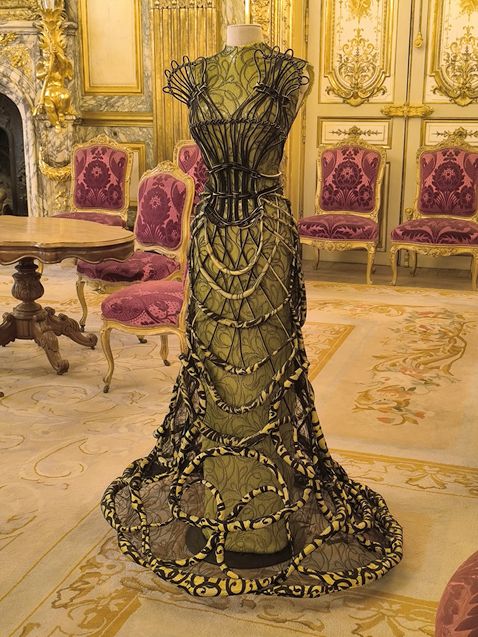 Fourreau en mousseline et paillettes amazone revoilées de fine dentelle, porté sous une robe longue à buste-cage « mannequin d’osier » en satin de soie canari et merle prolongé en volutes-serpentins.
