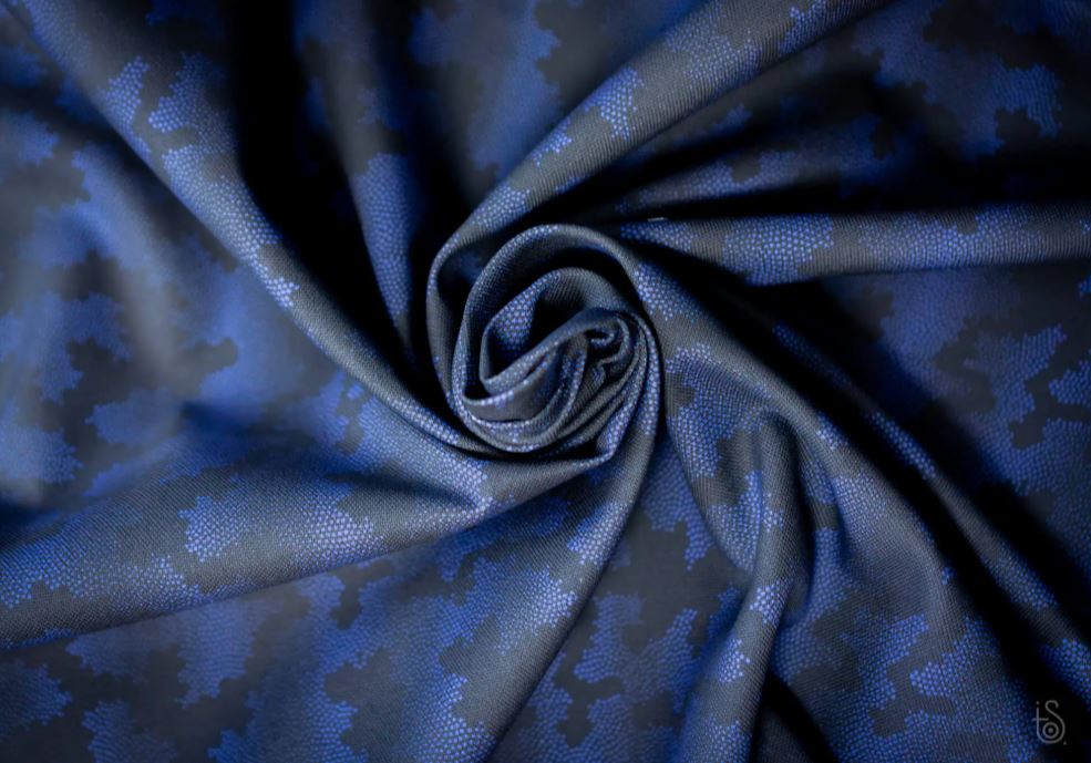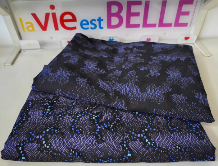 La particularité de ce tissu c’est qu’il est imprimé sur demande par une jeune créatrice qui vient de se lancer, ce qui implique une impression numérique avec des encres pigmentaires.