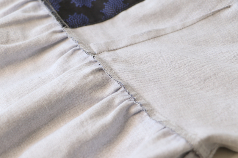 L’envers du tissu étant clair, j’ai opté pour des fils dans les même tons pour coudre les pinces et les coutures d’assemblage. Idem pour le surfil. Ci-dessous c’est la partie jupe froncée :