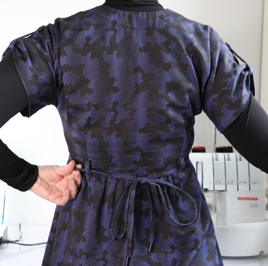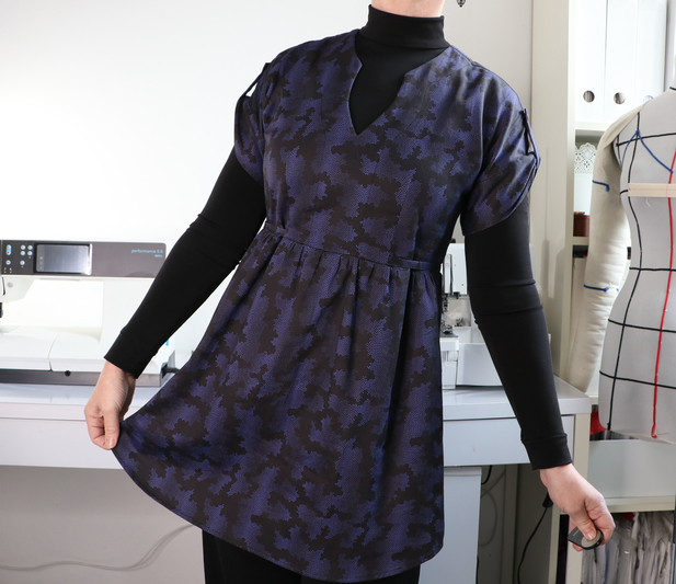 Pour cette quatrième version, j’ai de nouveau opté pour la blouse avec encolure tunisienne, manches retroussées et liens à nouer. Comme pour mes précédentes réalisations, j’ai allongé la blouse de 15 cm afin d’obtenir une tunique.