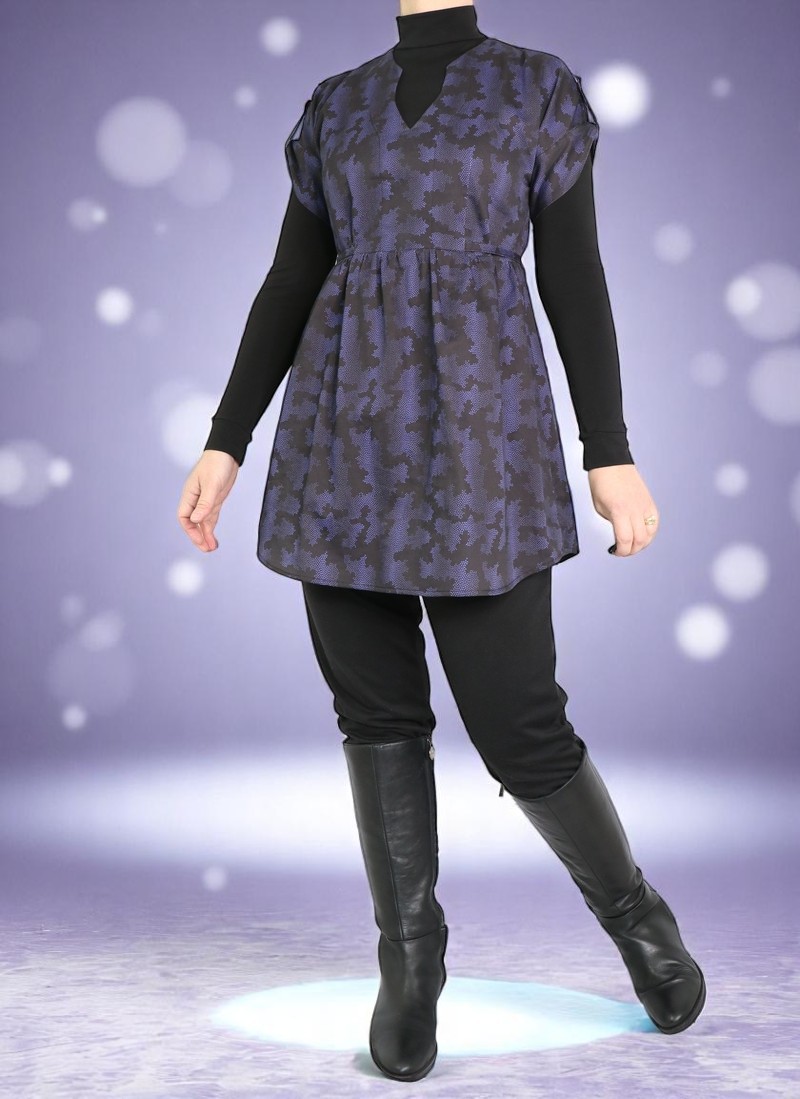 Il s’agit d’une robe ou d’une blouse semi-ajustée avec jupe froncée de forme liquette. Pour le corsage, deux décolletés en V sont proposés : Vue A : corsage boutonné au devant / Vue B : corsage avec encolure tunisienne. En option :