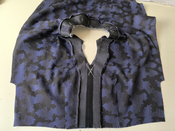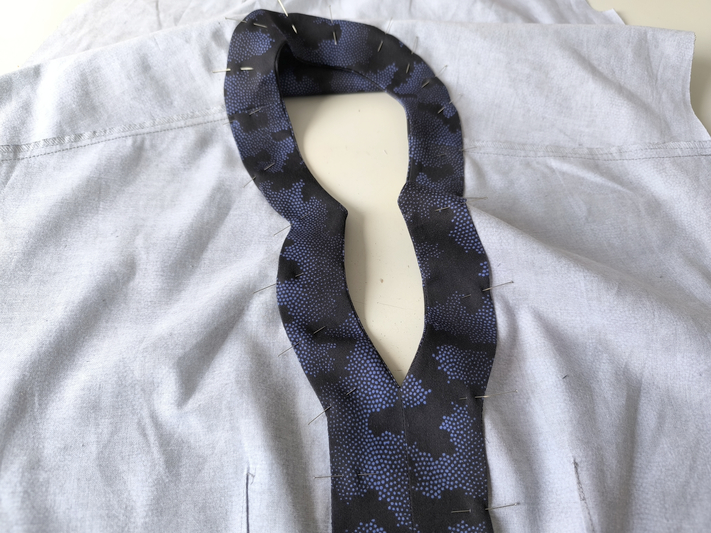 Une fois la parementure cousue, crantée & dégarnie, je la retourne sur l’endroit. On presse bien le tout au fer puis on épingle les bords :
