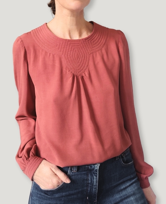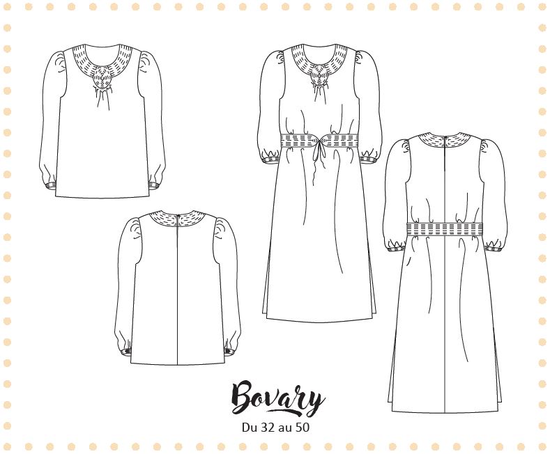Voici la description de Bovary : « Le patron de couture Bovary est une fusion parfaite de délicatesse et d’élégance. Son design unique s’articule autour d’un empiècement matelassé à l’encolure donnant toute sa sophistication au modèle. La douceur de ses poignets matelassés, en harmonie avec l’encolure, apporte une finesse inégalée à ce modèle ! Manches longues ou 3/4, blouse ou robe, exprimez votre créativité et apportez une touche d’élégance à vos tenues avec Bovary ! »