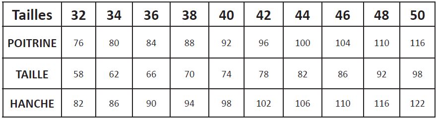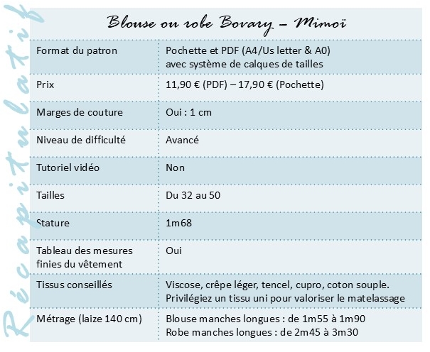 Bovary est proposé de la taille 32 à la taille 50. Il y a un tableau avec les mesures finies du vêtement, ce qui nous permet de savoir quelle aisance a été apportée au modèle.