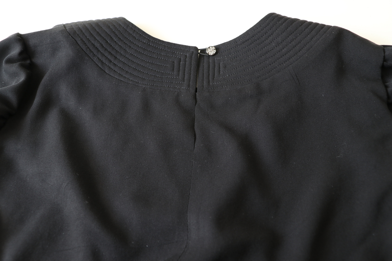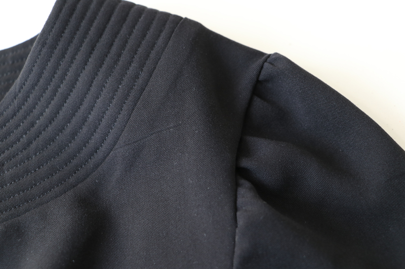 La tête de manche est froncée mais trop légèrement froncée à mon goût. En fait, il aurait fallu qu’il y en ait soit beaucoup plus soit pas du tout car là on est dans un entre deux qui laisse suggérer que la tête de manche est mal cousue… ça fait de vilains plis plutôt que de jolies fronces.
