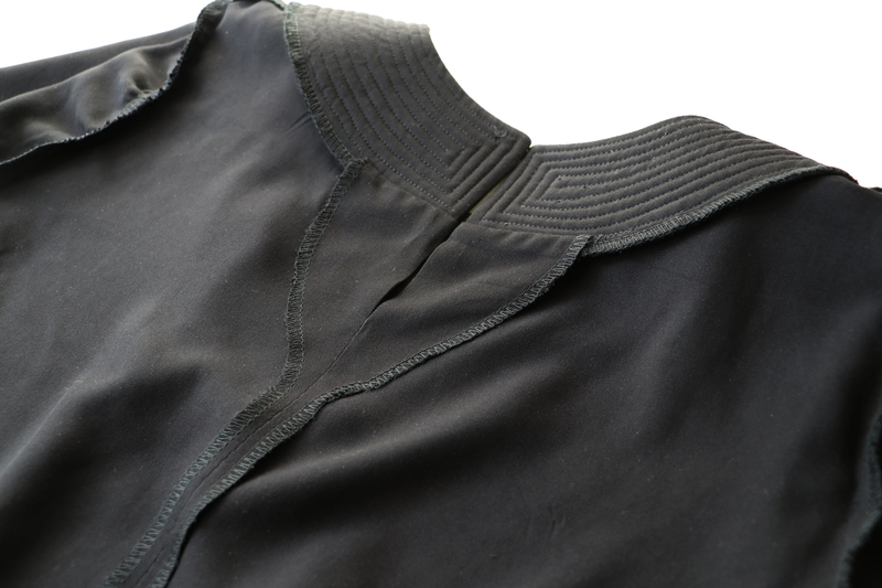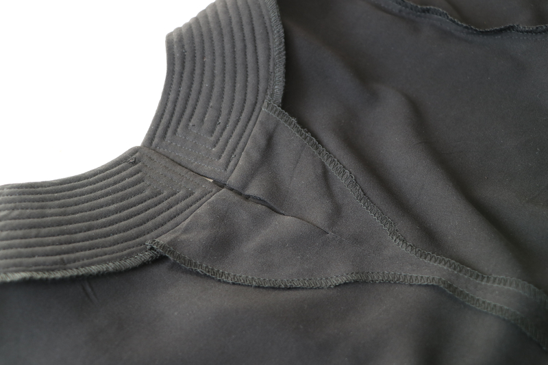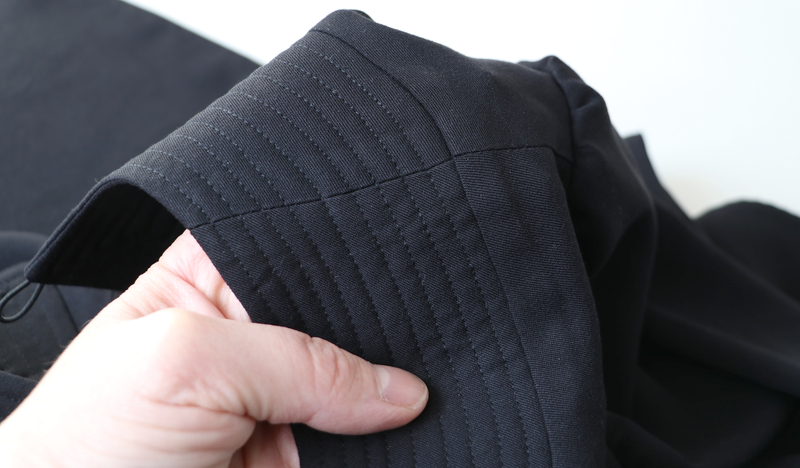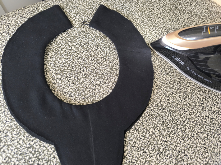 On assemble ensuite les pièces (l’une est juste entoilée, l’autre est entoilée & molletonnée) au niveau de la ligne d’épaule puis on presse au fer les coutures ouvertes.