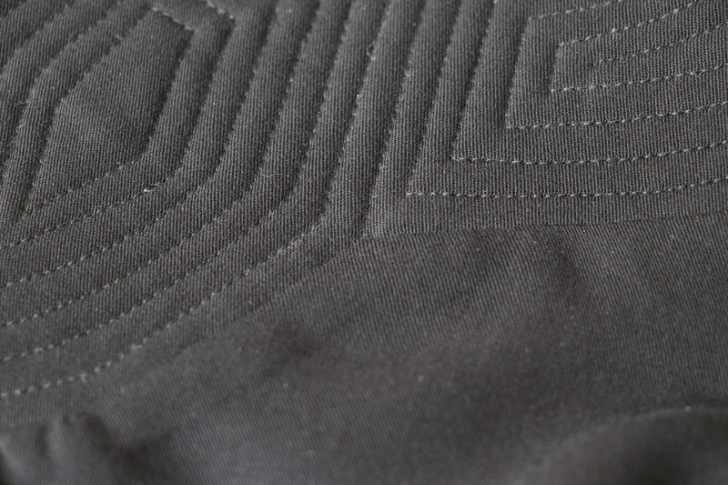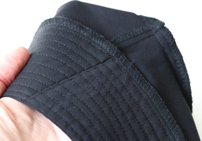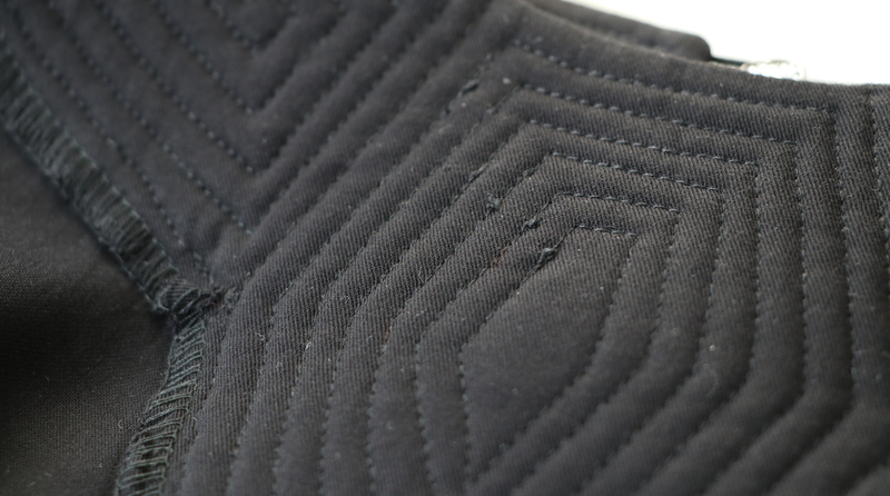 Le niveau de ce patron est indiqué comme étant « avancé », ce que je confirme. La difficulté réside au niveau de l’empiècement molletonné qui demande du temps, de la minutie et certaine forme de dextérité. Il y a en effet un gros travail de surpiqûres et l’empiècement est qui est plus incrusté au devant (qui dit incrustations, dit angles à gérer !).