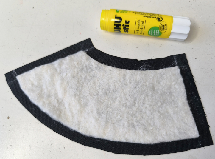 Système D, comme cette ouate n’était pas thermocollante, j’ai utilisé un tube de colle classique. Ce n’est pas l’idéal mais ça a tout de même fonctionné (habituellement on utilise de la colle temporaire en spray pour la faire adhérer le molleton au tissu) :