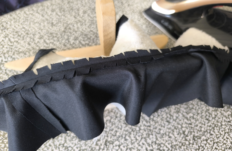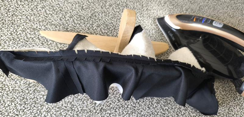 On crante dans les arrondis, on dégarnit les angles, puis on presse au fer les marges de couture ouvertes (j’utilise ici un support en bois multifonctions bien pratique) :