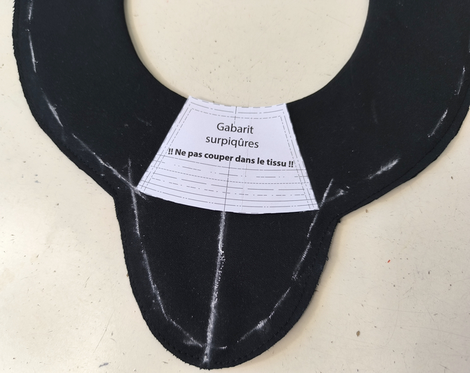 On trace ensuite à la craie ou au crayon effaçable les valeurs de couture de 1 cm (côté empiècement non molletonné) :