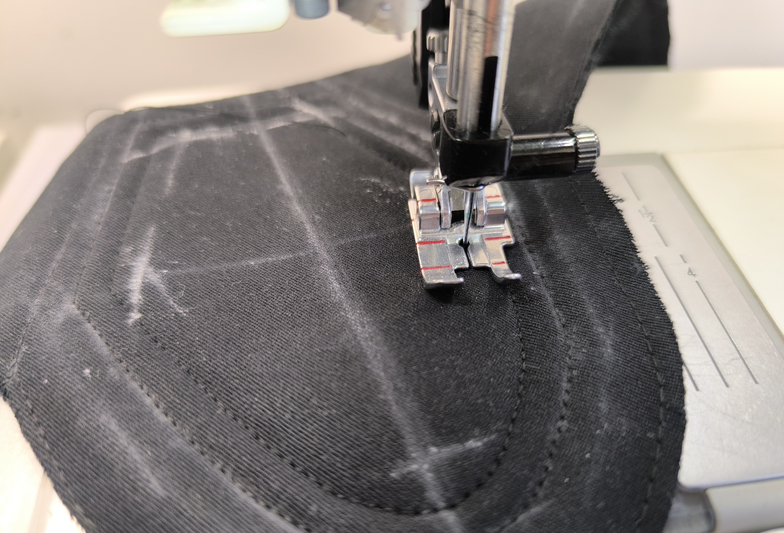 Pour obtenir des surpiqûres à peu près régulières, j’ai utilisé le pied de biche Pfaff 1/4 de inch qui permet de faire des lignes à 0,6 du bord. Dans le livret d’instructions, il est préconisé de faire des surpiqûres à 0,7. Du coup, j’ai au final une ligne de plus par rapport à ce qui est indiqué (idem pour la ceinture) :