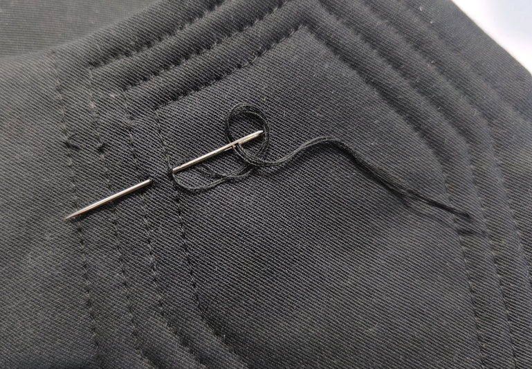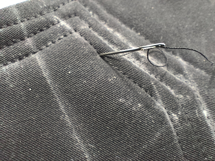 Pour éviter d’avoir de vilains points d’arrêts, je n’en ai tout simplement pas fait. Pour ce faire, j’ai tout simplement rentré les fils sur l’envers et j’ai noué les fils ensemble. C’est ce que j’avais notamment fait sur ma veste Pilar. Côté endroit, je passe les fils sur l’envers grâce à une aiguille :