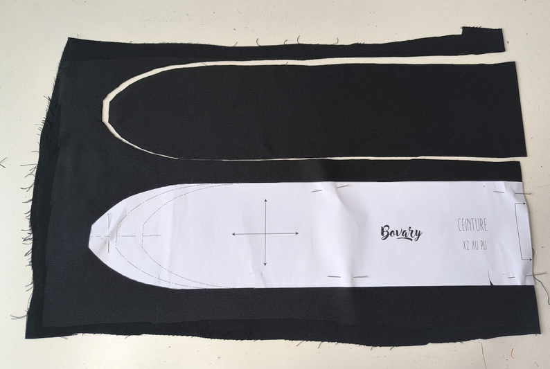 Dans le livret, il n’est pas indiqué d’entoiler les pièces de l’empiècement mais moi j’ai préféré le faire (j’ai entoilé l’intérieur et l’extérieur avec un entoilage fin acheté chez Fil 2000). Il me parait en effet important d’entoiler au préalable la pièce de tissu avant de poser par-dessus du molleton. C’est un conseil que j’avais appris grâce à Véro de Sacôtin qui en parle dans cet article. Au point de détail : je préfère entoiler tout un rectangle et ensuite seulement découper mes pièces patron, ça évite ainsi de les déformer lors de la coupe. Alors c’est sûr qu’on gaspille un peu d’entoilage mais c’est ainsi bien plus précis. Ci-dessous ce sont mes pièces patron pour la ceinture (que j’ai donc également entoilée) :