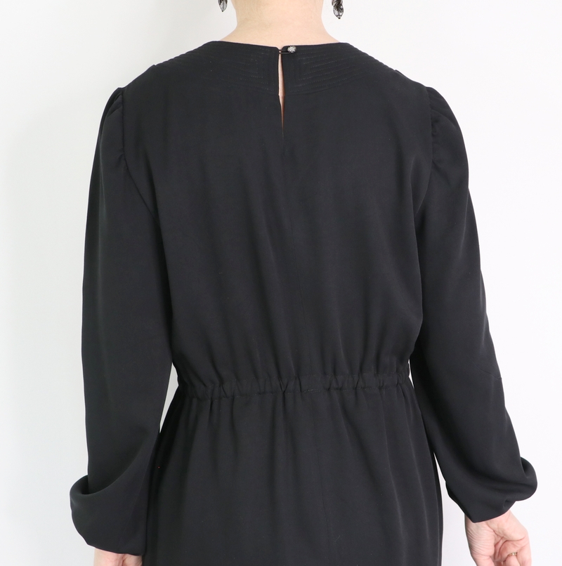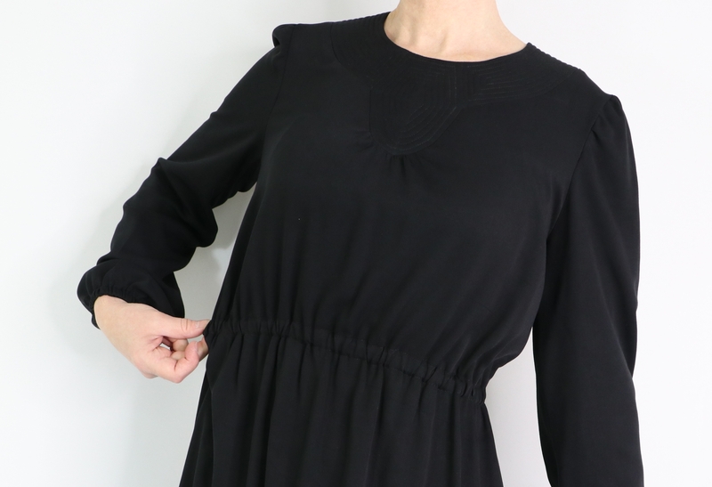 L’empiècement court jusque dans le dos. Il est prévu une ouverture au milieu dos pour pouvoir enfiler la blouse/robe aisément.