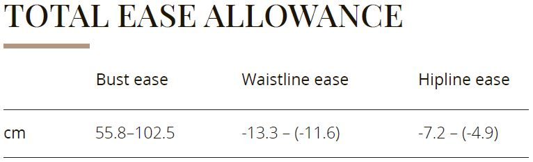 Il y a un tableau qui précise l’aisance prévue dans ce patron : une aisance positive pour la poitrine mais attention : une aisance trèèèèèèèès négative pour la taille et les hanches !