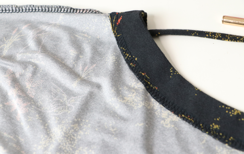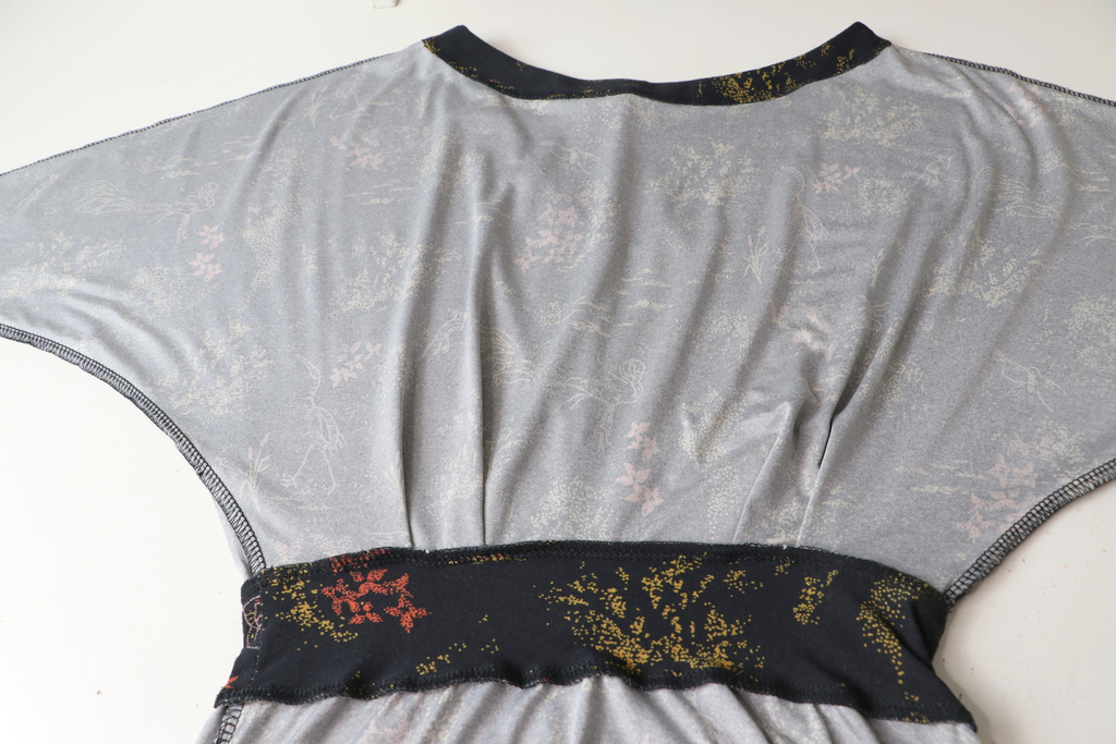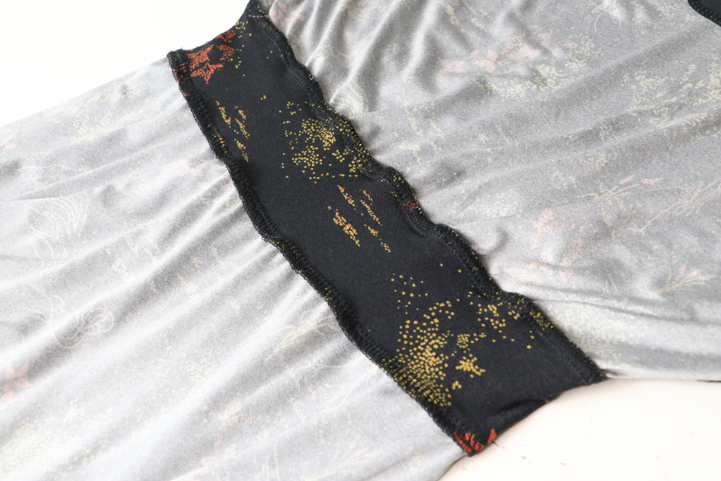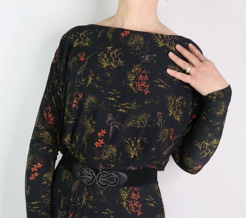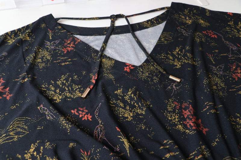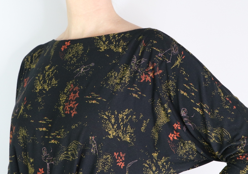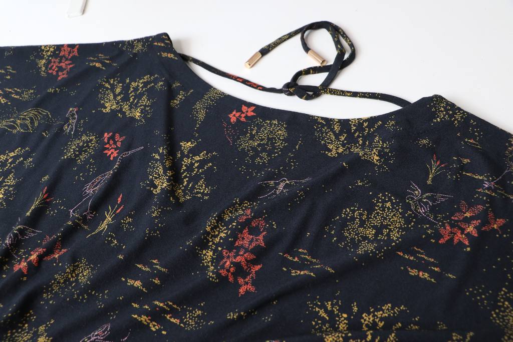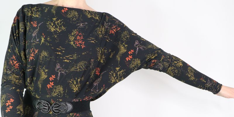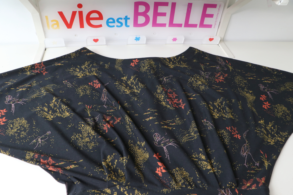 Le choix du tissu est par conséquent ultra importante ! Il faudra en effet opter pour un jersey de poids moyen ayant un fort taux d’élasticité (60%). Votre échantillon de 10 cm doit donc pouvoir s’étirer jusqu’à 16 cm. J’ai pour ma part opté pour ce jersey polyester & élasthanne qui convenait parfaitement en terme d’élasticité. J’étais un peu sceptique sur les -13,3 cm annoncés au niveau de la taille mais au final ça convient très bien grâce à ce jersey stretch ! J’ai acheté ce coupon dans la boutique Modes & Travaux / Les Coupons de Saint-Pierre 20€ les trois mètres. J’aime bien cet imprimé sur fond noir.
