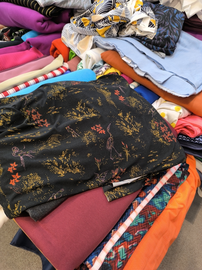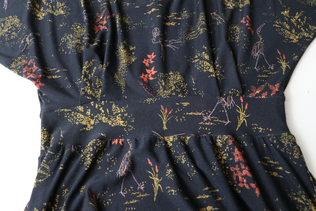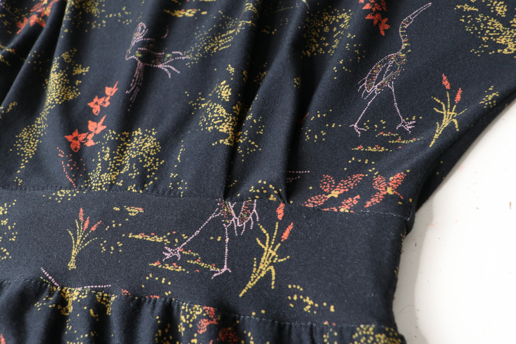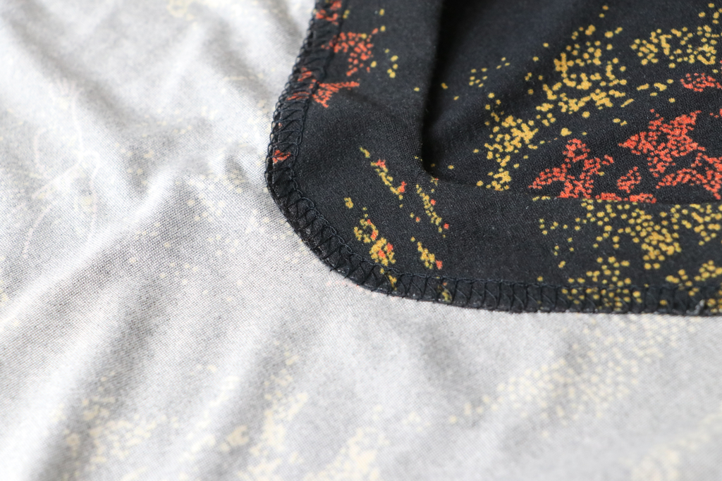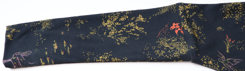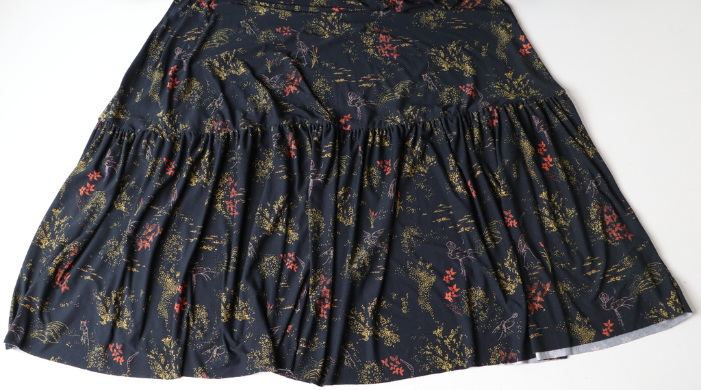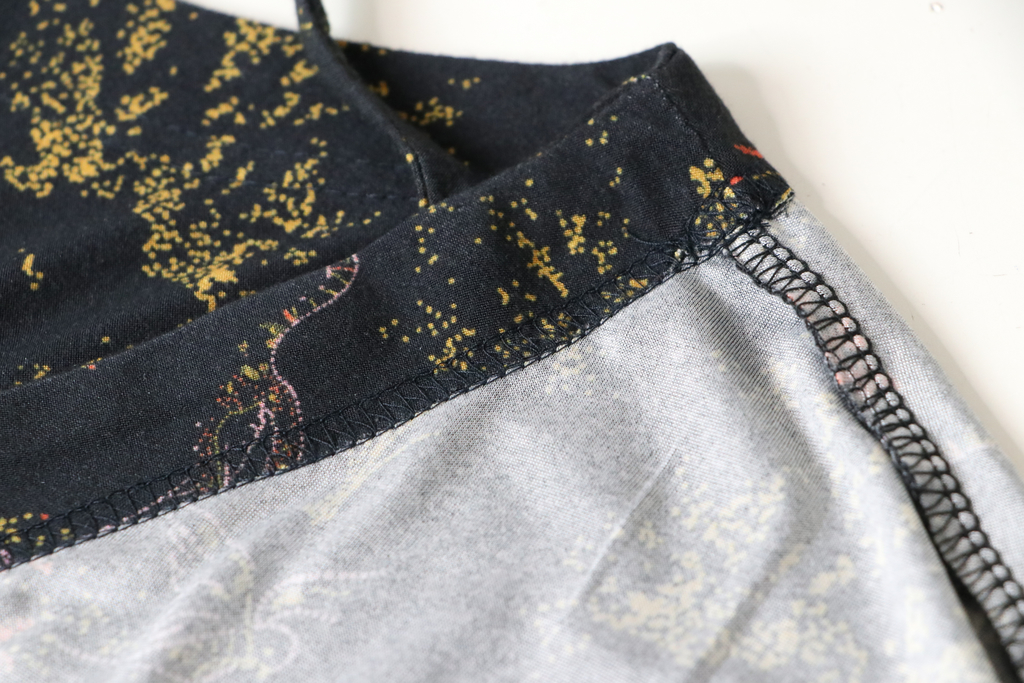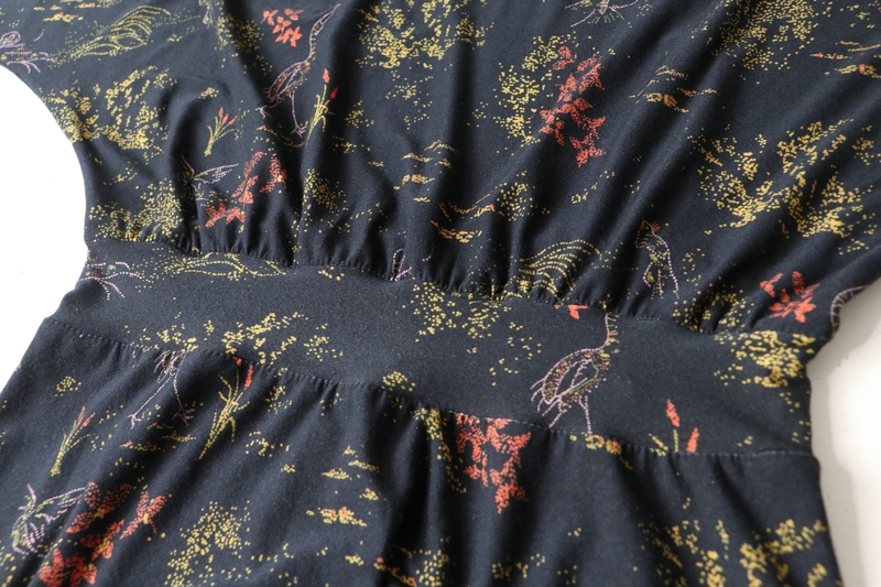 Le choix du tissu est par conséquent ultra importante ! Il faudra en effet opter pour un jersey de poids moyen ayant un fort taux d’élasticité (60%). Votre échantillon de 10 cm doit donc pouvoir s’étirer jusqu’à 16 cm. J’ai pour ma part opté pour ce jersey polyester & élasthanne qui convenait parfaitement en terme d’élasticité. J’étais un peu sceptique sur les -13,3 cm annoncés au niveau de la taille mais au final ça convient très bien grâce à ce jersey stretch ! J’ai acheté ce coupon dans la boutique Modes & Travaux / Les Coupons de Saint-Pierre 20€ les trois mètres. J’aime bien cet imprimé sur fond noir.