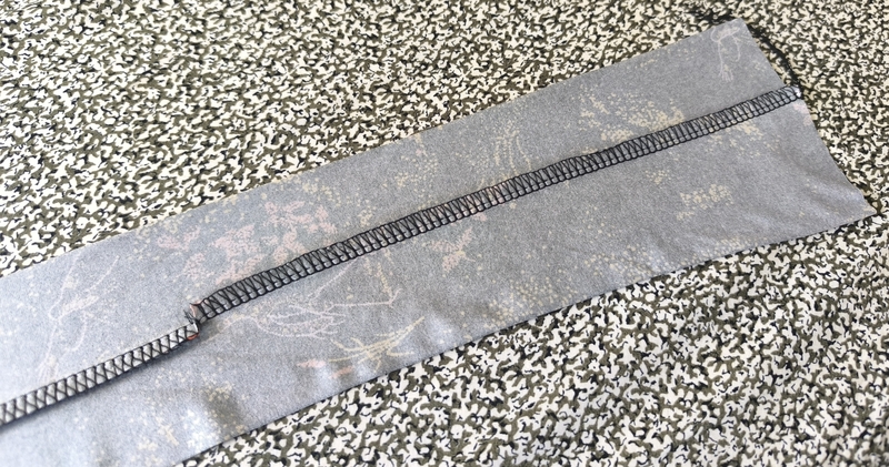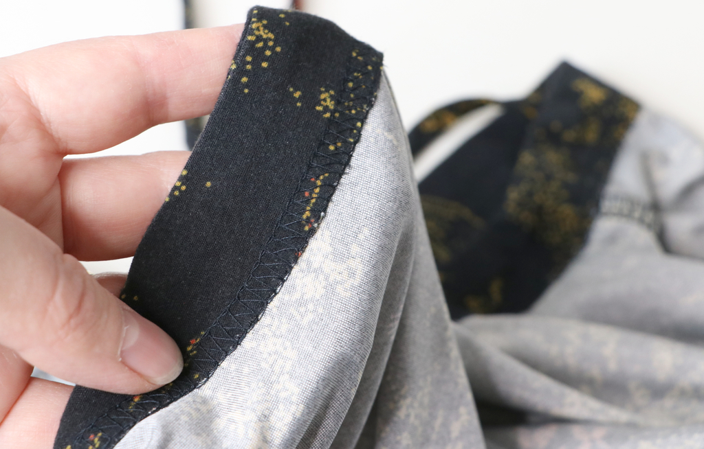 Je précise que je les ai entoilées avec un entoilage thermocollant fin pour maille. Je les ai fixées en place pour qu’elles restent bien positionnées sur l’intérieur. Pour ce faire, j’ai utilisé ma recouvreuse (2 aiguilles, point de recouvrement large).