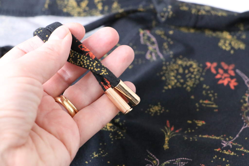L’encolure dos est prévue avec des liens à nouer. J’ai ici fini les extrémités par des embouts métalliques dorés.