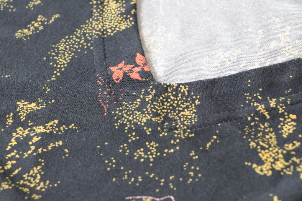 Le niveau de difficulté indiqué est 2,5 avec la mention « convient aux débutants ». A mon sens, la difficulté majeure se situe au niveau de la finition de l’encolure car la technique proposée est celle du biais rapportée avec la gestion délicate de l’angle (encolure dos). Perso, je préféré me faciliter les choses en cousant des parementures. Pour ce faire, j’ai tout simplement repris l’empreinte de l’encolure devant & dos sur une largeur de 4 cm, marges de couture incluses. Pour la pointe, en revanche, j’ai fait un arrondi pour que ce soit ensuite plus facile à surpiquer.