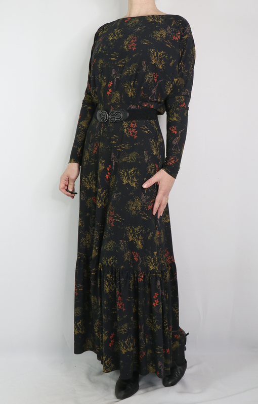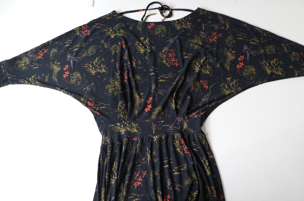 Le premier patron que j’ai décidé de coudre est la robe Quilla. qui est une robe semi-ajustée, marquée à la taille. Le corsage de coupe loose est proposé avec des manches chauve-souris resserrées par de longs & fins poignets. L’encolure est ronde au devant et en V avec un lien à nouer au dos. La jupe longue est très moulante et s’arrête au-dessus des chevilles.