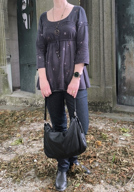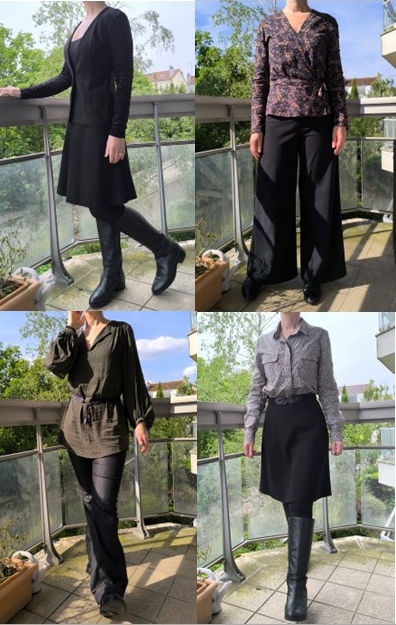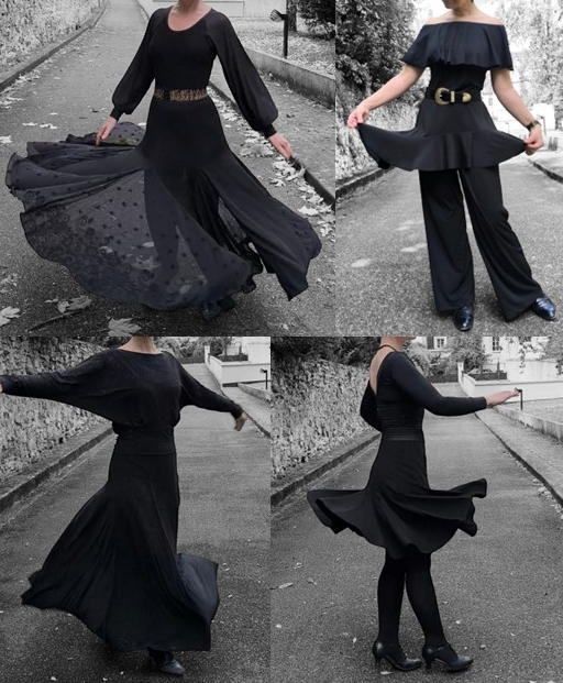 Si on fait les comptes, il y a au moins 9 robes, 11 jupes, 9 pantalons, 21 hauts, 12 vestes/gilets, 4 manteaux et 3 sacs. Cela représente un total de 69 réalisations coutures différentes présentées. En réalité, j’en ai porté bien plus, mais je n’ai pas photographié toutes mes tenues cocooning ni celles pour dormir ! Parmi les tenues photographiées, certains vêtements ont été cousus il y a plus de 10 ans. Je pense notamment à ma jupe de danse (2013), mon pantalon Anima (2014) et mon Ginger Jeans (2015). La réalisation la plus récente étant le top Quilla de VikiSews (pas encore blogué) cousu dans un jersey noir pailleté associé à une jupe à panneaux réalisée dans le même tissu.
