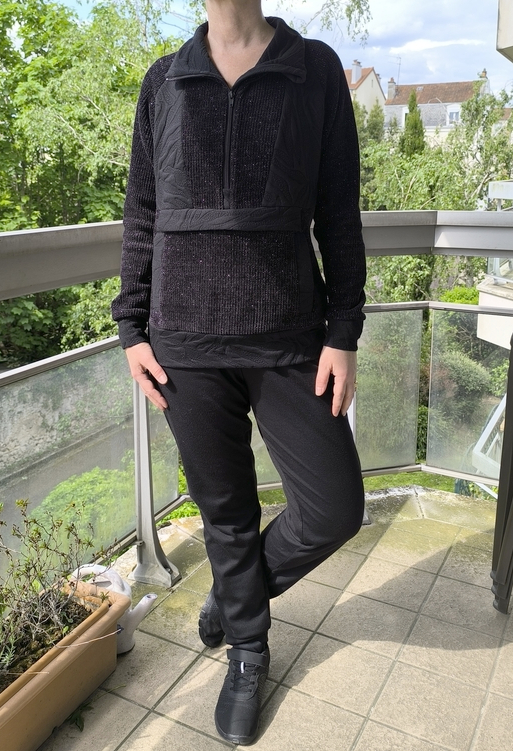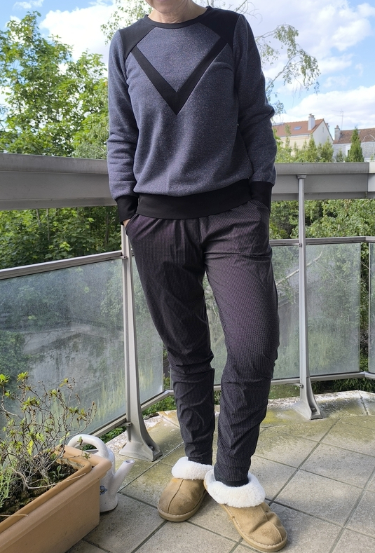 Ou encore cette tenue ultra douillette avec un autre Anima pant (non blogué) et mon sweat Morgan de Sinclair Patterns aux multiples détails techniques :