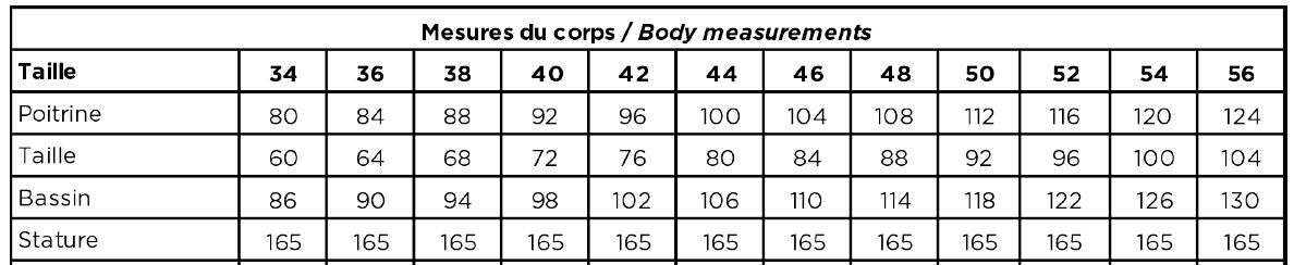 Ce patron est proposé de la taille 34 à la taille 56. Un tableau avec les mesures finies du vêtement permet de se rendre compte de l’aisance apportée au modèle. C’est un patron indiqué comme étant oversize.