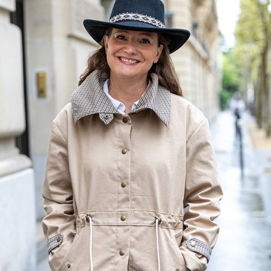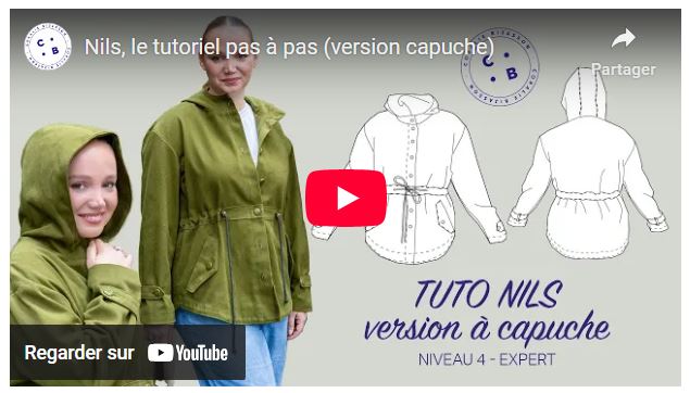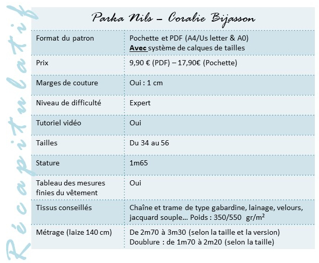 Il s’agit de la parka Nils de Coralie Bijasson dont voici la description : « Transformez votre garde-robe avec la parka Nils, un modèle de parka oversize, polyvalent et élégant. Conçu pour s’adapter à toutes les morphologies, ce patron couvre une large gamme de tailles, du 34 au 56, pour permettre à chacune de créer la parka parfaite. Ce patron versatile propose deux options de style : une parka avec capuche pour un look pratique et moderne, ou avec un maxi col pour une touche sophistiquée. Les détails soignés, tels que les poches passepoilées à rabats et la coulisse de taille permettant de mettre en valeur votre taille, ajoutent à la fois fonctionnalité et féminité à cette pièce intemporelle. Créez une parka Nils qui allie style, confort et praticité pour une pièce maîtresse de votre garde-robe, intemporelle et adaptée à toutes les occasions. Chaque détail du patron de la parka Nils a été pensé et élaboré avec passion en France. »