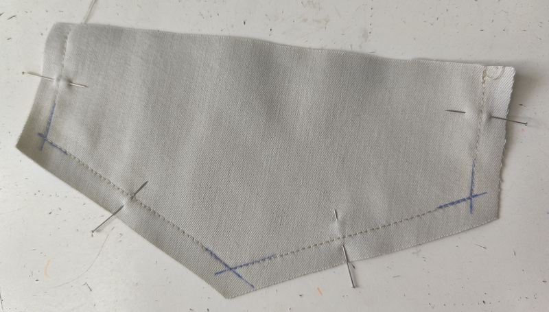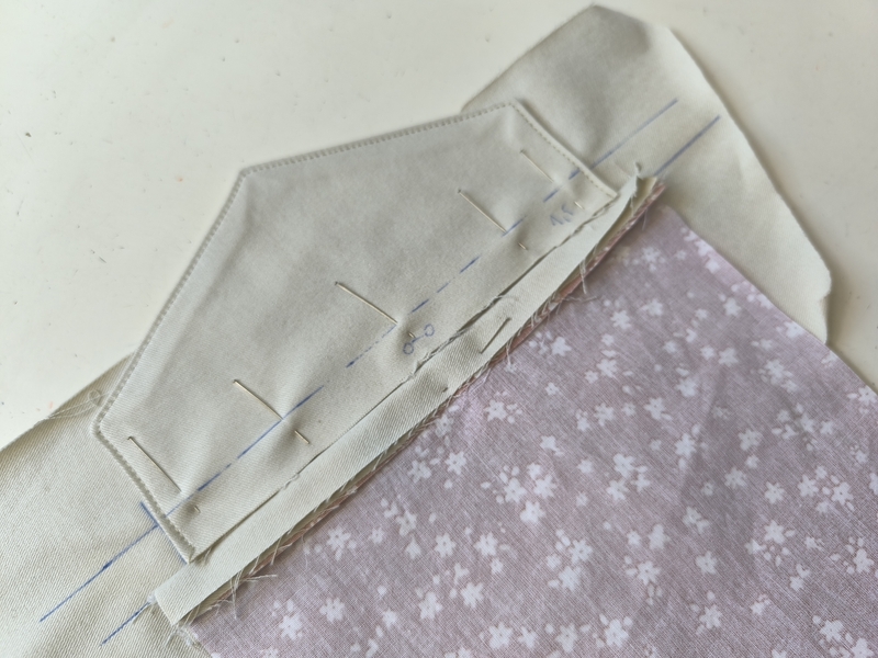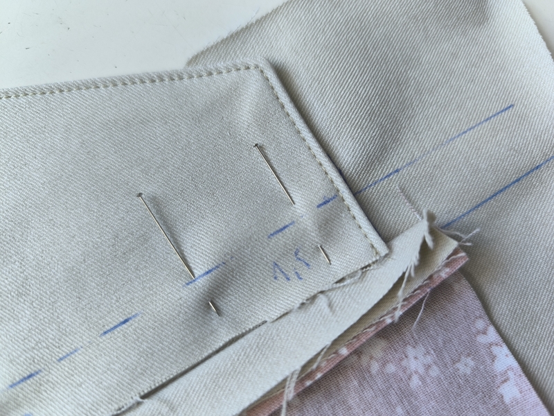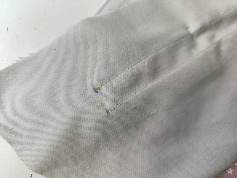 Pour les poches passepoilées à rabats, j’ai réalisé au préalable une pièce d’étude. Cela m’a permis d’être plus confiante sur celles qui allaient être définitives. Cela m’a également permis de voir où étaient les points qui demandaient une attention particulière. On le sait, tout est affaire de précision, de minutie et de millimètres ! Perso, je n’hésite pas à tracer mes repères à la craie ou comme ici au stylo frixion.