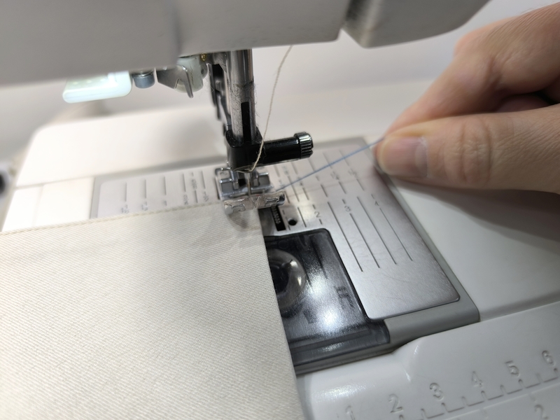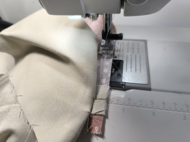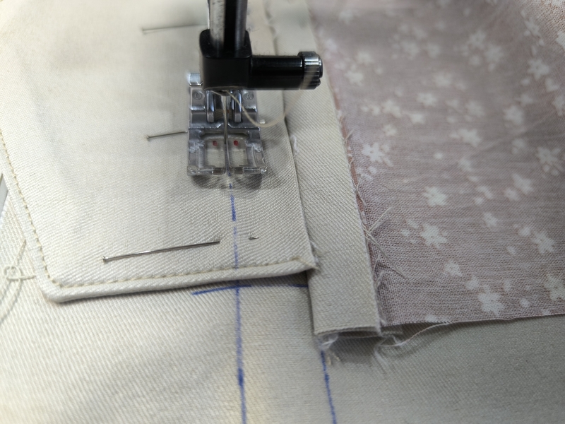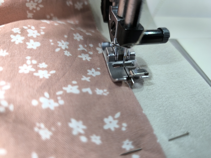 J’utilise ici le pied de biche Pfaff « piqûre dans la couture » qui, grâce à son guide, permet de coudre avec plus de précisions :
