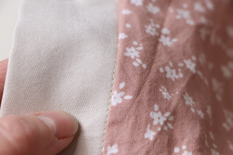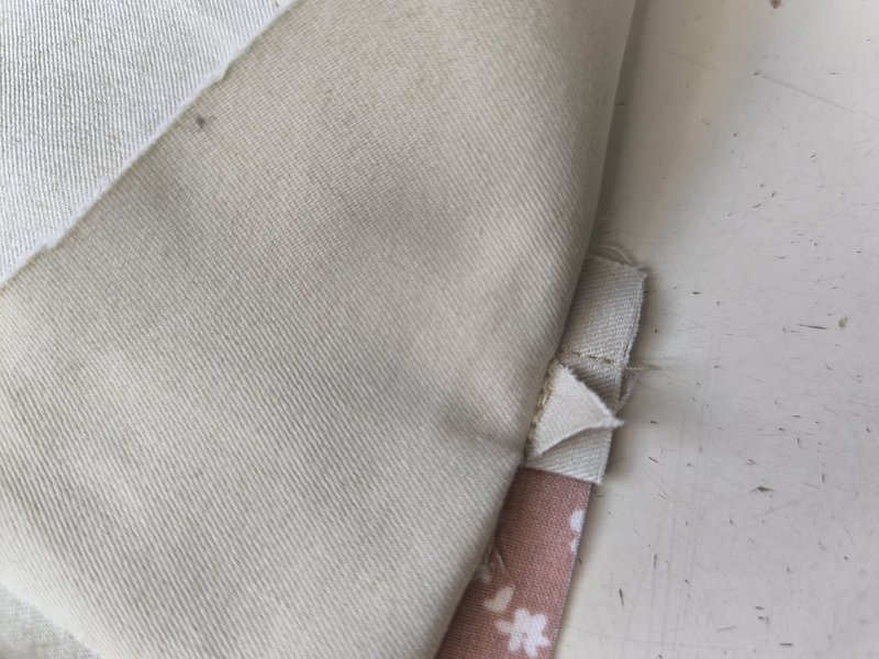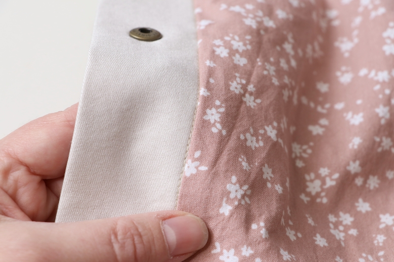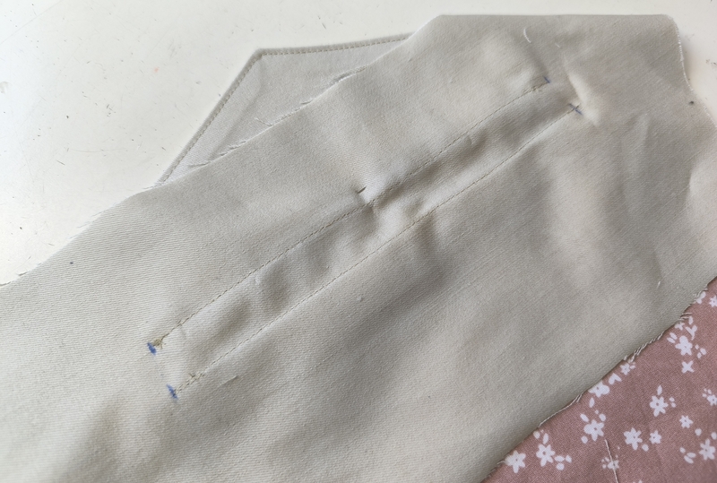 Quand je soulève la poche, on voit le bouton pression. Pour renforcer cette zone, je l’ai entoilée et j’ai ajouté un petit morceau de tissu.