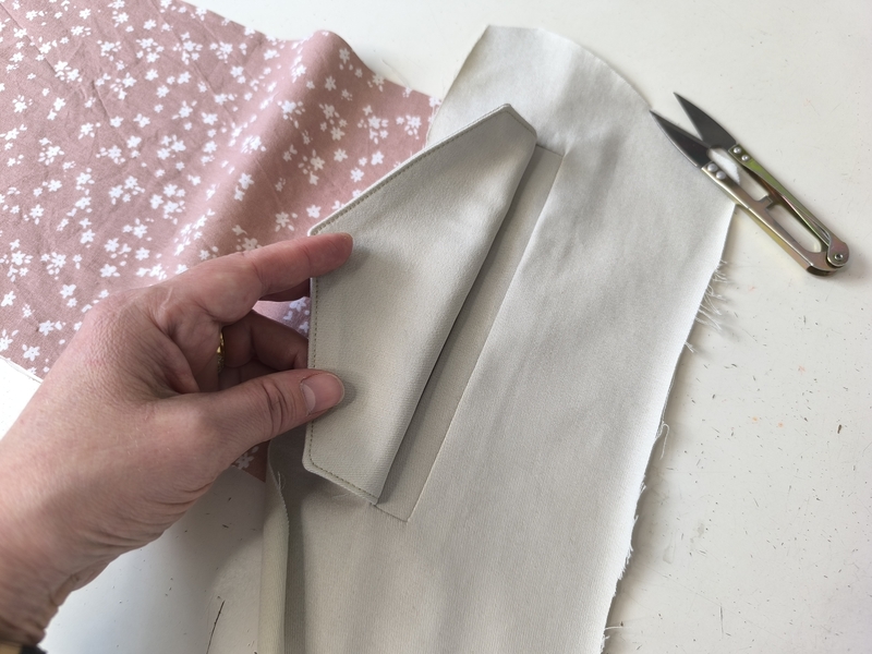 Heureusement oui ! Il reste encore une étape finale (outre la gestion des manches) : la surpiqûre. On vient en effet fixer la patte de boutonnage et l’ourlet en effectuant une piqûre dans le sillon de la couture.