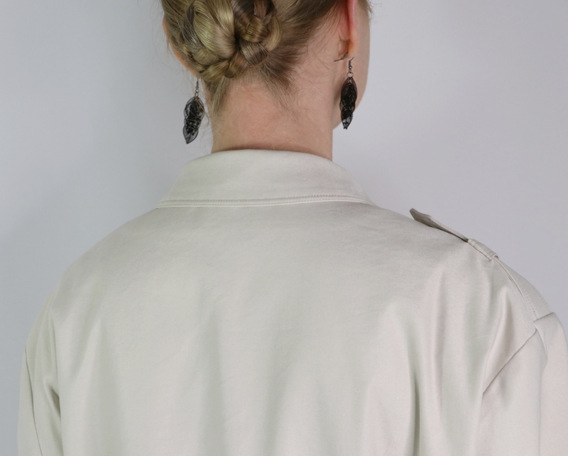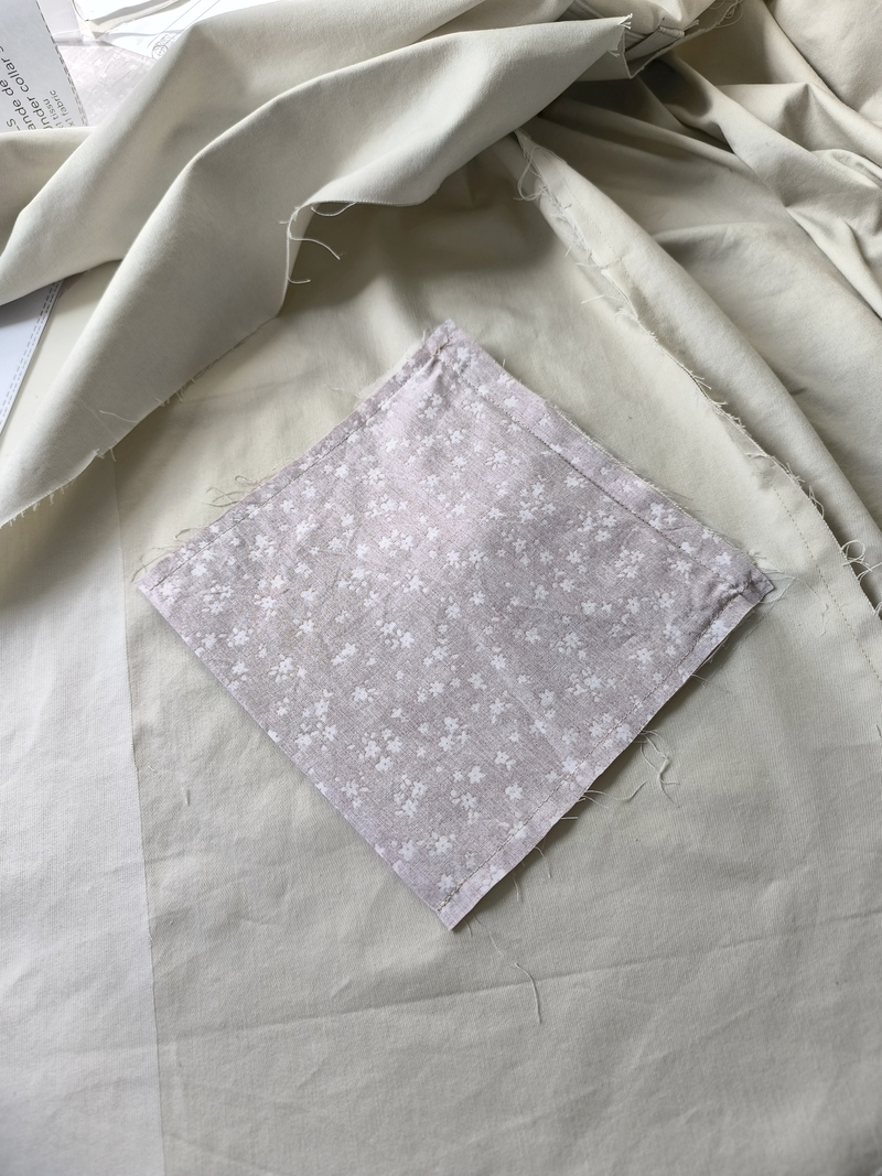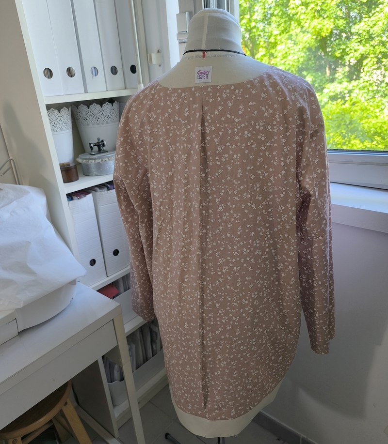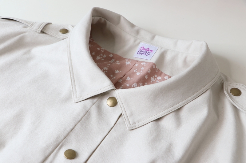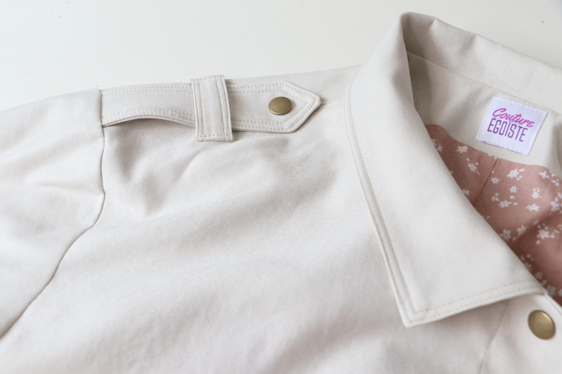 Ce détail me plaisant bien, j’ai décidé d’ajouter également des pattes au niveau des épaules. ça vient ainsi rehausser le haut de la veste, j’aime beaucoup ! A noter que les manches sont tombantes (visuellement j’aime moins…). Côté couture c’est en tout plus simple à gérer car il n’y a pas d’embu à gérer