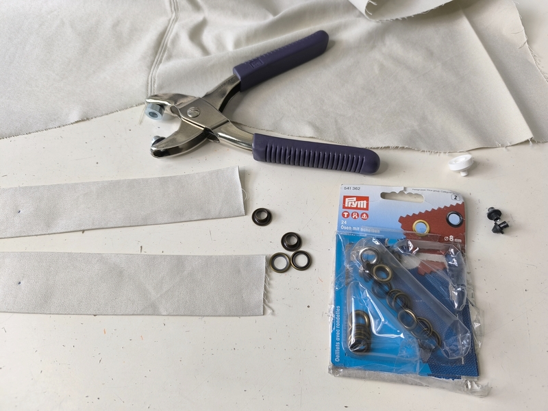 J’ai ici utilisé des œillets Prym et les stop cordons viennent de chez Fil 2000.