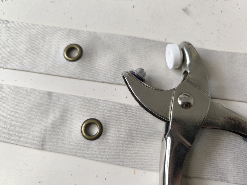 Voici la ceinture en cours de couture. Ce sont ici des œillets de la marque Prym que j’ai posés avec facilité grâce à la pince de cette même marque :