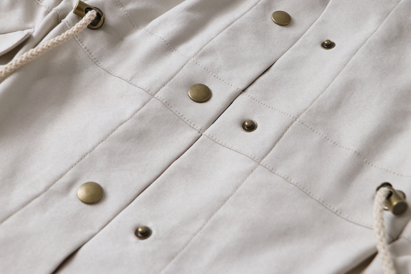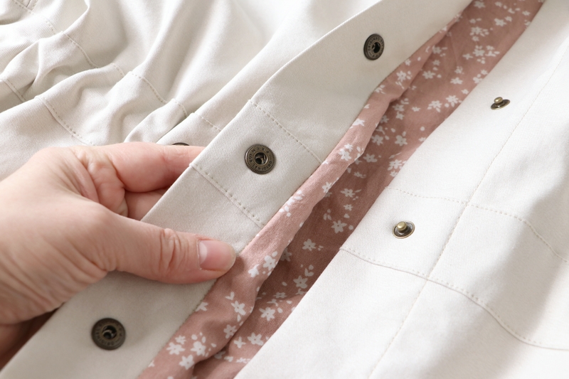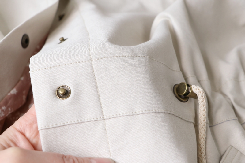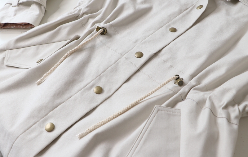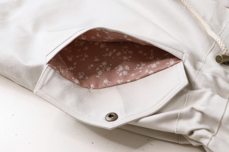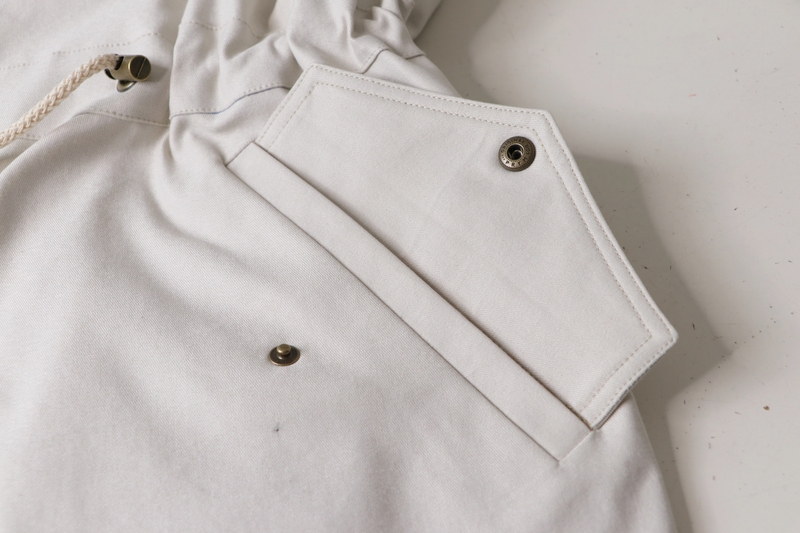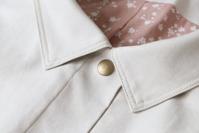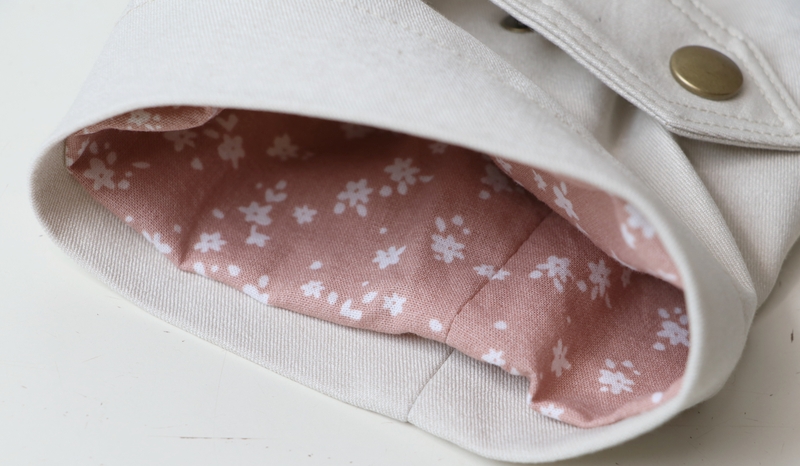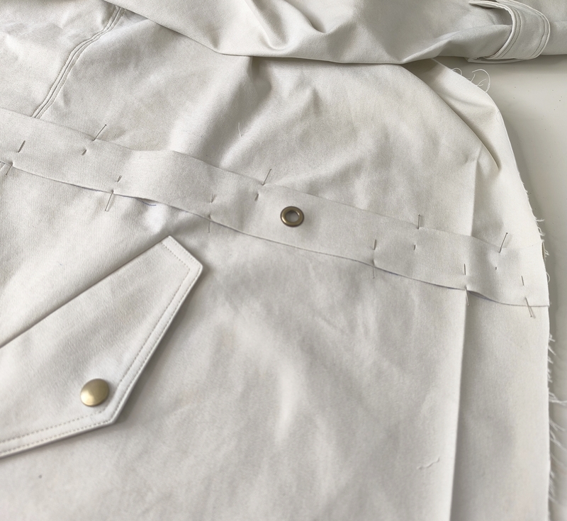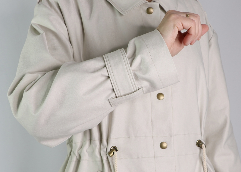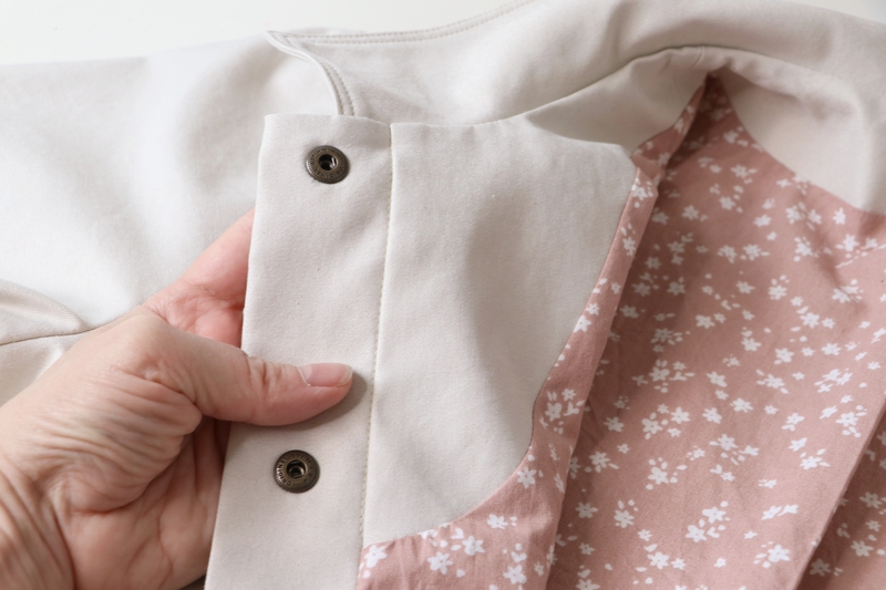 La veste se ferme au devant par des boutons. J’ai ici opté pour des pressions anorak Prym qui se posent aisément grâce à la pince (tuto ici). Les pressions viennent-elles aussi de chez Fil 2000. La patte de boutonnage se forme par un simple pliage, il s’agit donc ici d’une parementure à même qu’on vient ensuite surpiquer à la toute fin.