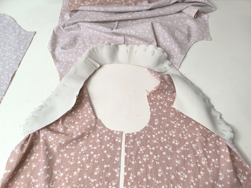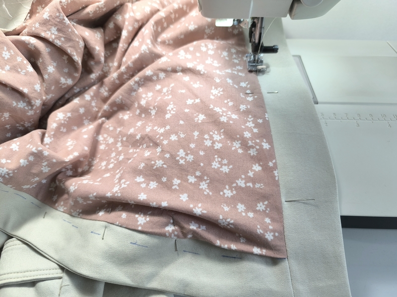 Une fois cette étape réalisée, on vient assembler les deux vestes endroit contre endroit en cousant tout le bas et tout le haut de la veste, le col est ainsi pris en sandwich entre les deux épaisseurs.