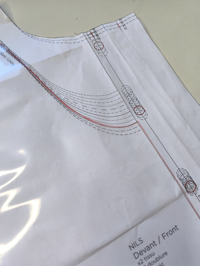 J’ai cependant revu les proportions du col car je le trouvais vraiment trop imposant. Pour ce faire, j’ai tout simplement repris la pièce col et recoupé le patronage comme vous pouvez le voir ci-dessous :